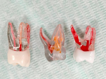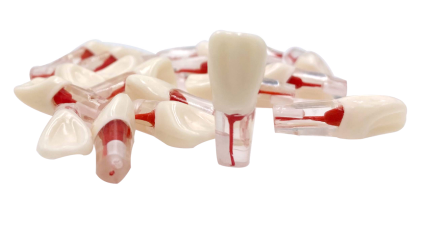 带有仿真根管的树脂牙,牙冠为白色树脂材质,牙根为透明树脂材质,带有红色仿真髓腔。 |