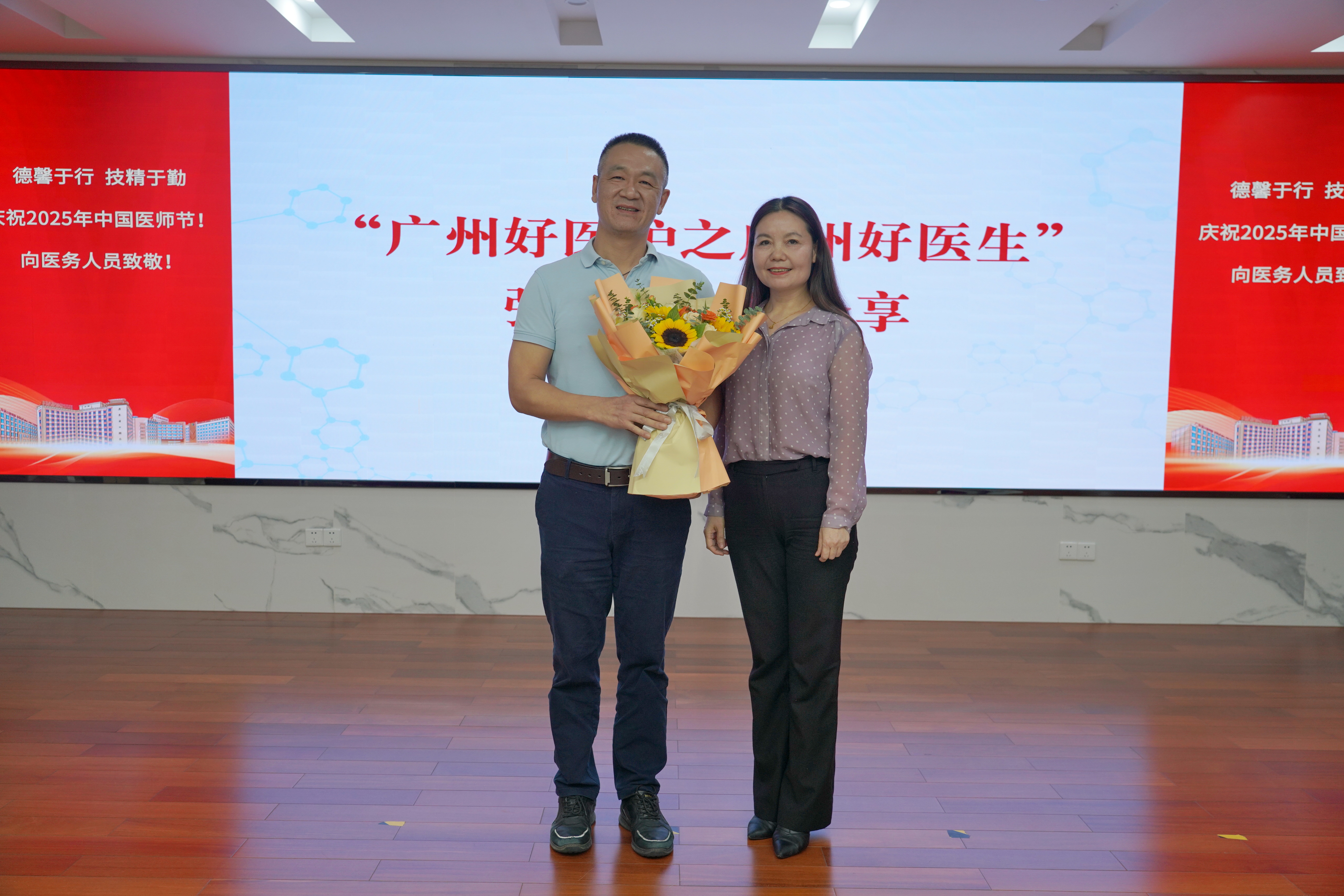 8月19日上午,医院领导班子成员分别带队前往总院区、番禺院区、海珠广场院区、盘福院区各临床科室,向医务工作者献上鲜花和节日的诚挚祝福。