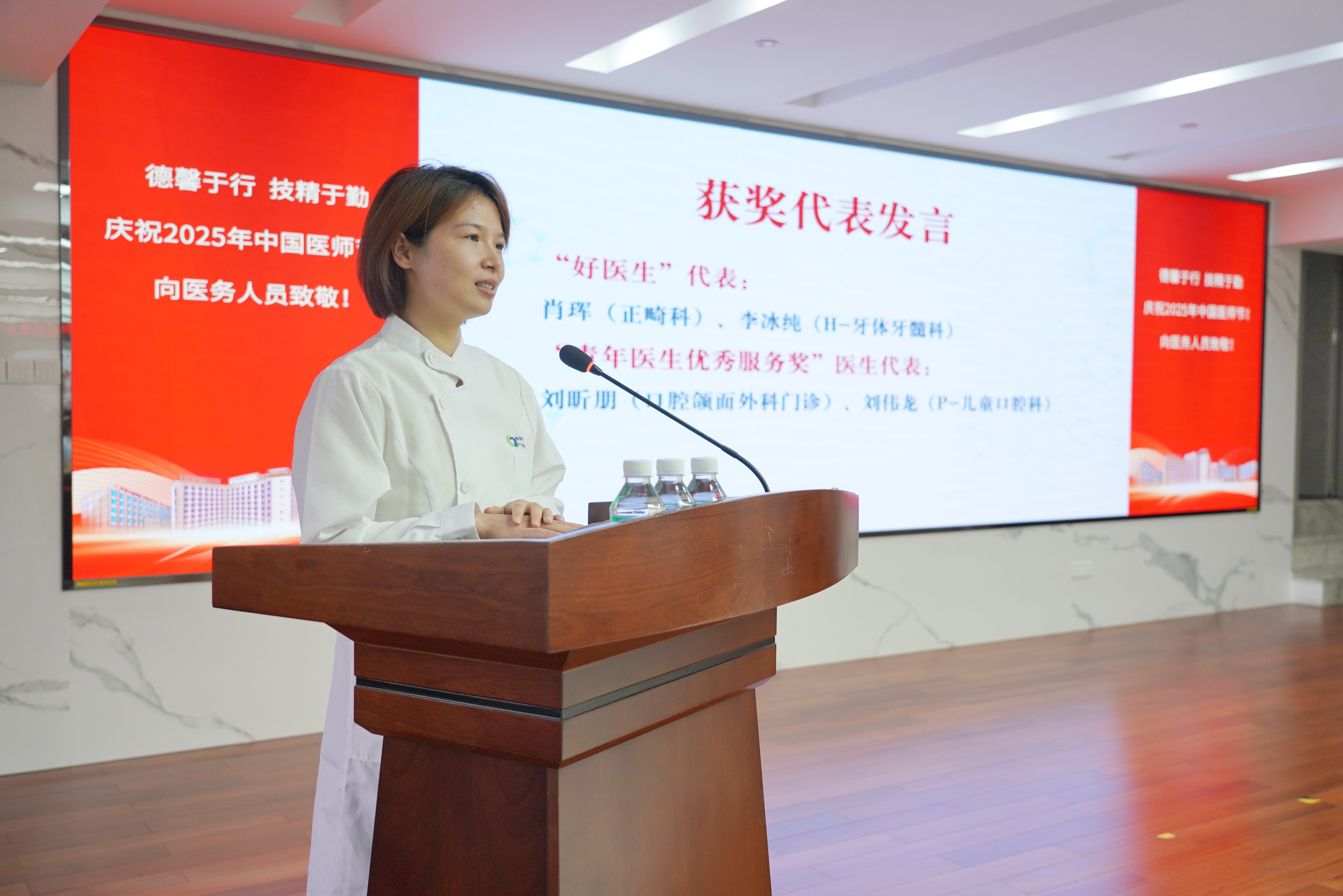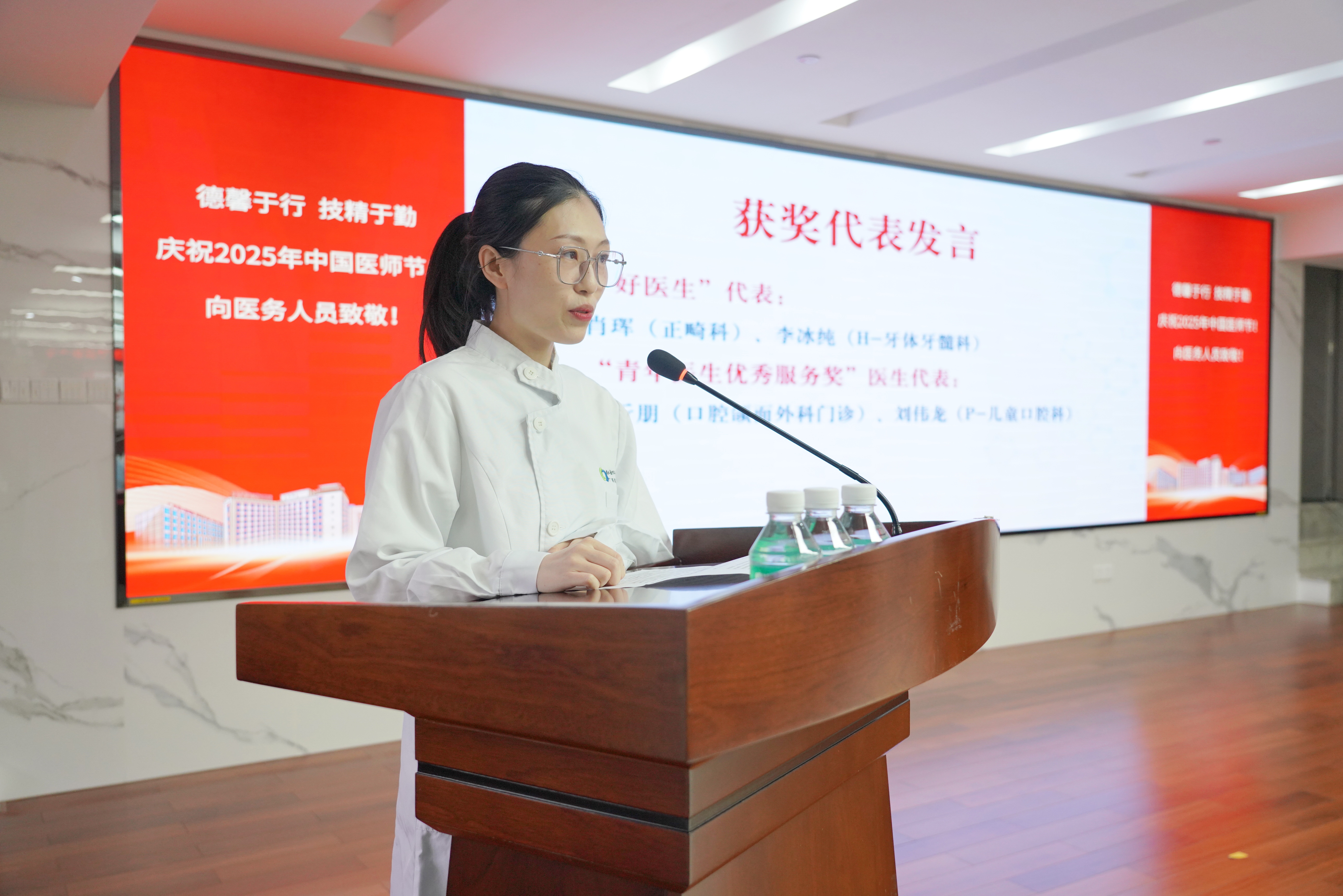 在徐淑兰副院长领誓下,7名青年获奖医师代表登台,带领全体医生庄严重温《中国医师宣誓誓词》。“健康所系,性命相托”的铿锵誓言回荡会场,彰显口腔医者守护健康的初心使命。