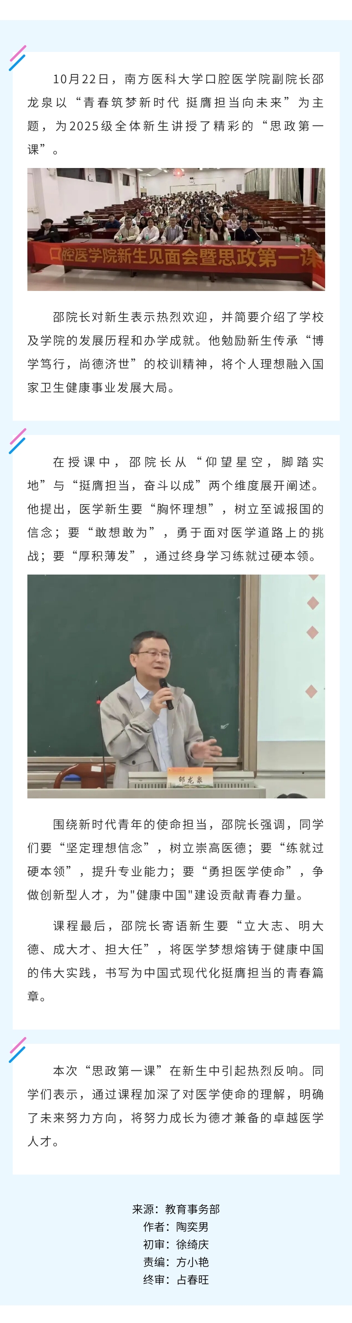 青春筑梦启新程,思政领航话担当——邵龙泉副院长为口腔医学院2025级新生开讲第一课