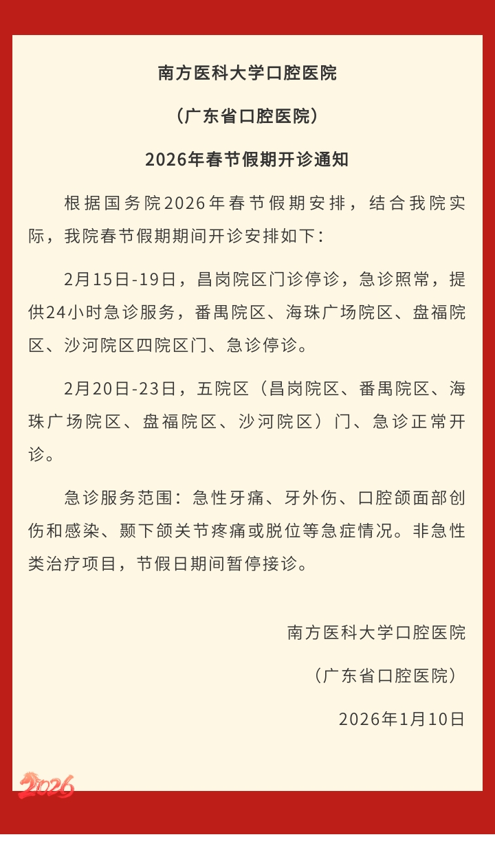 南方医科大学口腔医院(广东省口腔医院)2026年春节假期开诊通知
