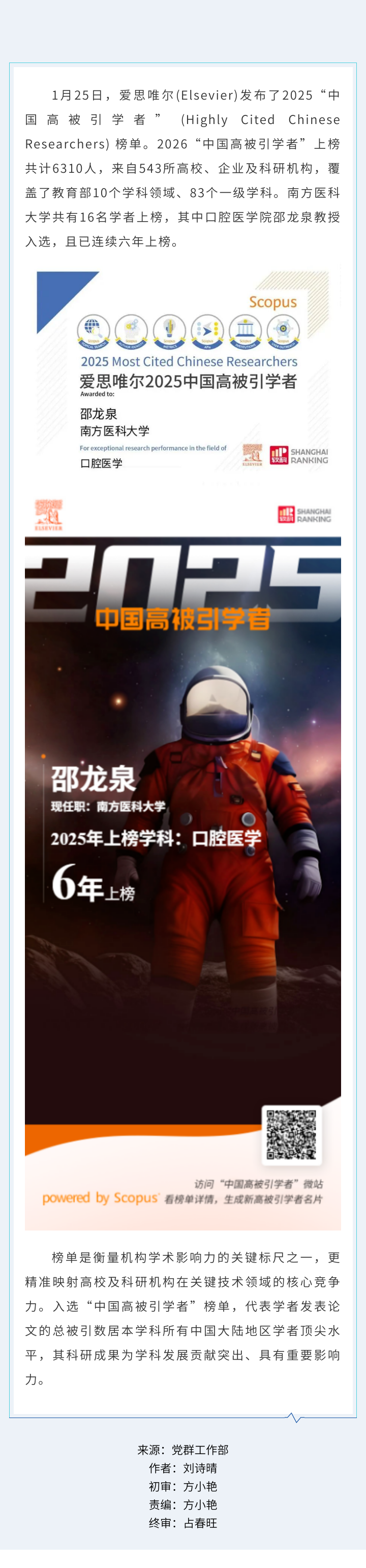 口腔医院邵龙泉教授连续六年上榜爱思唯尔“中国高被引学者”榜单