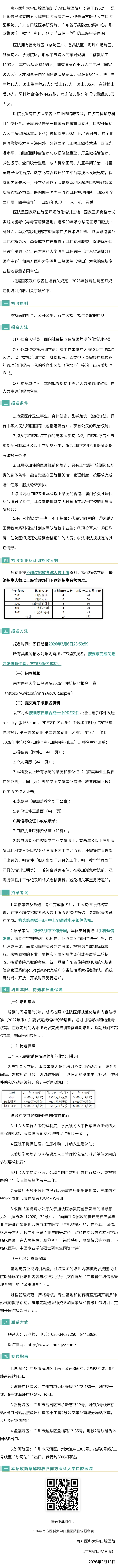 南方医科大学口腔医院(广东省口腔医院)2026年住院医师规范化培训招收简章