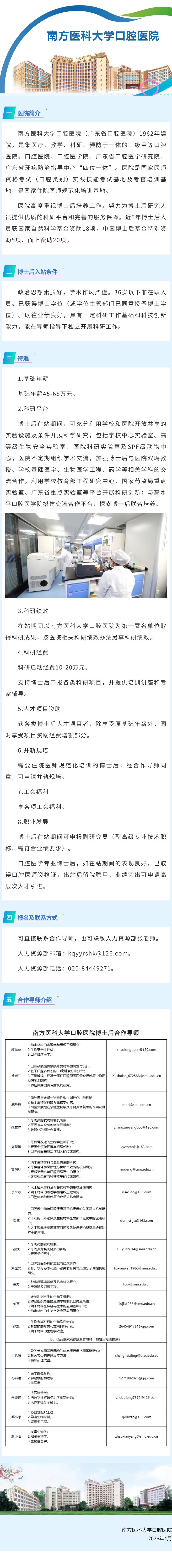 南方医科大学口腔医院2026年博士后研究人员招聘及合作导师介绍