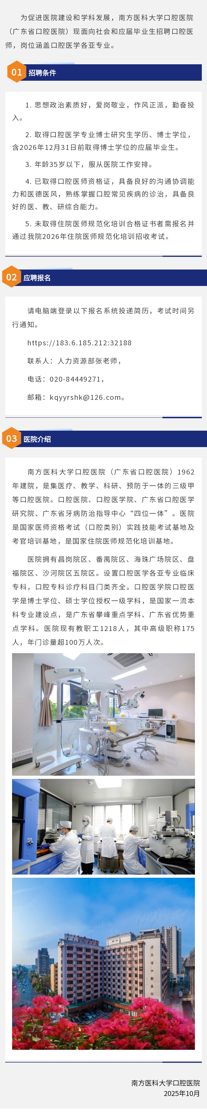 南方医科大学口腔医院2026年口腔医师招聘启事